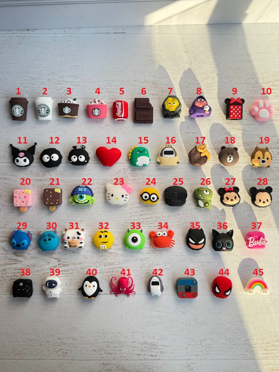 40-پنگوئن, 41-هشت پا, 42-کوسه طوسی, 43-نینتندو, 45-ابر رنگین کمان, 5- کوکاکولا, 6-شکلات, 7-باب گنگ, 8-پاتریک گنک, 9-مینی موس خال خالی, 44-اسپایدرمن, 1-استارباکس لیوانی قهوه ای, 10-پنجه صورتی, 11-کرومی, 12-هپل ساده, 13-هپل شاخ دار, 14-قلب, 15-بچه دایناسور, 16-کوسه هودی دار, 17-خرس بیسکویتی, 18-خرس قهوه ای, 19-سنجاب, 2-استارباکس لیوانی سفید, 20-بستنی چوبی صورتی, 21-بستنی چوبی قهوه ای, 22-مایک کلاه دار, 23-هلوکیتی, 24-مینیون دو چشم, 25-اسکلت, 26-دایناسور برقی, 27- چهره مینی موس, 28- چهره میکی موس, 29-استیچ, 3-فراپاچینو قهوه, 30-سالیوان, 31-گاو, 32-ام اند ام, 33-بچه مایک تک چشم, 34-خرچنگ, 35-بتمن, 36- گربه چشم تیله, 37-باربی, 38-دسته ایکس باکس, 39-فضانورد, 4-فراپاچینو توت