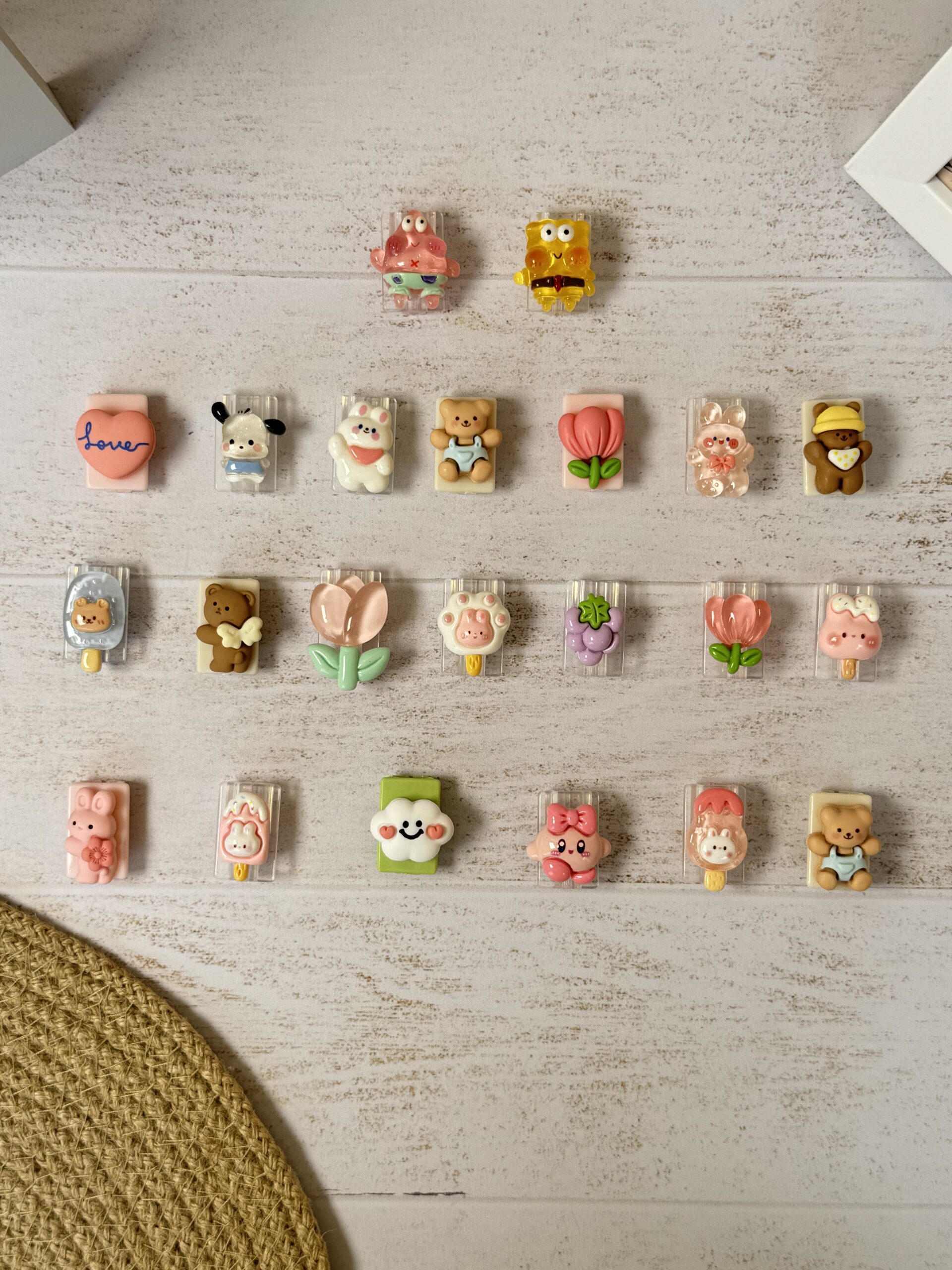20-دیجی مون صورتی, 2- باب شیشه ای, 19- ابر, 18-بستنی خرگوش صورتی, 17-خرگوش صورتی گلدار, 16- آبنبات خرگوشی صورتی, 15- لاله شیشه ای کوچک, 14-انگور, 13-بستنی پنجه سفید, 11-خرس بالدار, 12-لاله شیشه ای بزرگ, 10-بستنی چوبی سر خرس, 1-پاتریک شیشه ای, 9- خرس قهوه ای کلاه دار, 8-خرگوش شیشه ای, 7-لاله مات, 6- خرس قوه ای سرهمی پوش, 5- خرگوش سفید, 4-سگ شیشه ای, 3-قلب لاو, 21-بستنی شیشه ای خرگوشی