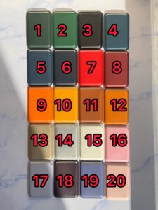1-مشکی, 2-سفید, 3-طوسی, 4-صورتی کمرنگ, 5-سرخابی, 6-سبزآبی
