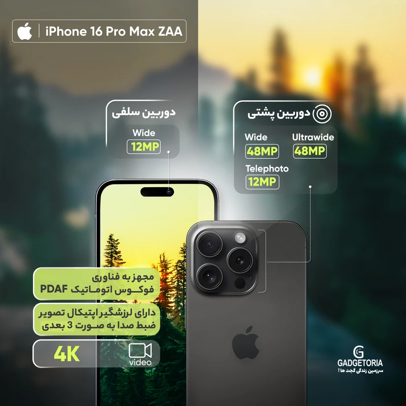 آیفون 16 پرو مکس با سیستم دوربین سهگانه ۴۸، ۱۲ و ۴۸ مگاپیکسلی ارائه شده است که شامل دوربین اصلی، تلهفوتو و فوق عریض میشود.
